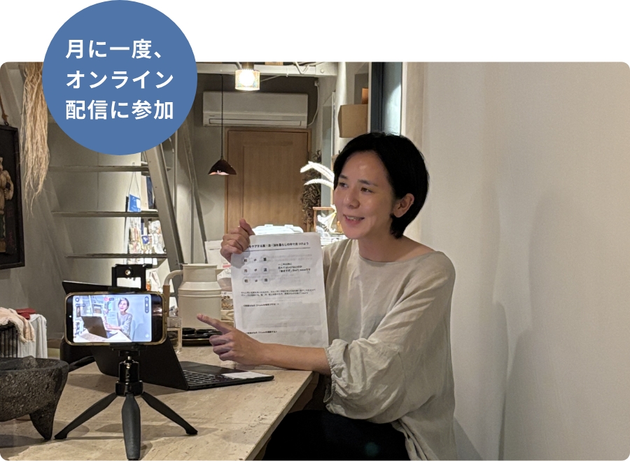 リアル参加で開催しているクラスと同じ内容のものを、月に一度オンラインで配信する「オンライン参加」のクラス。リアルタイムでもアーカイブでも参加できるので、自宅でもどこでも、好きなところから好きな時に視聴が繰り返し視聴が可能です。